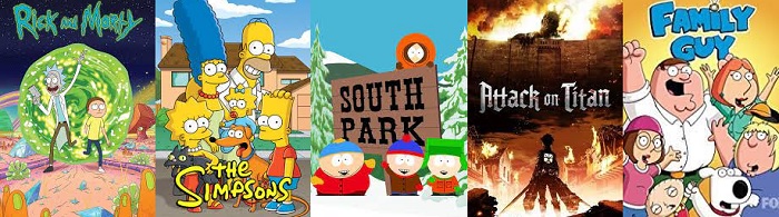 Cadenas: Fuji TV (7), FOX (6), TV Tokyo (6), Netflix (6), MBS TV (6), Cartoon Network (5), Nickelodeon (3), Nippon TV (2), Adult Swim (1), Fox Kids (1), Comedy Central (1), FX (1), Disney Channel (1), AT-X (1), Amazon Prime Video (1), Disney+ (1)*.