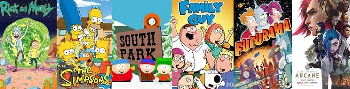 Cadenas: Adult Swim (10), Netflix (10), FOX (7), Comedy Central (4), Amazon Prime Video (3), ABC (3), MTV (3), FX (1), Disney+ (1), DC Universe (1), Hulu (1), Webserie (1), HBO (1), Paramount+ (1), HBO Max (1), Teletoon (1), UPN (1)*.